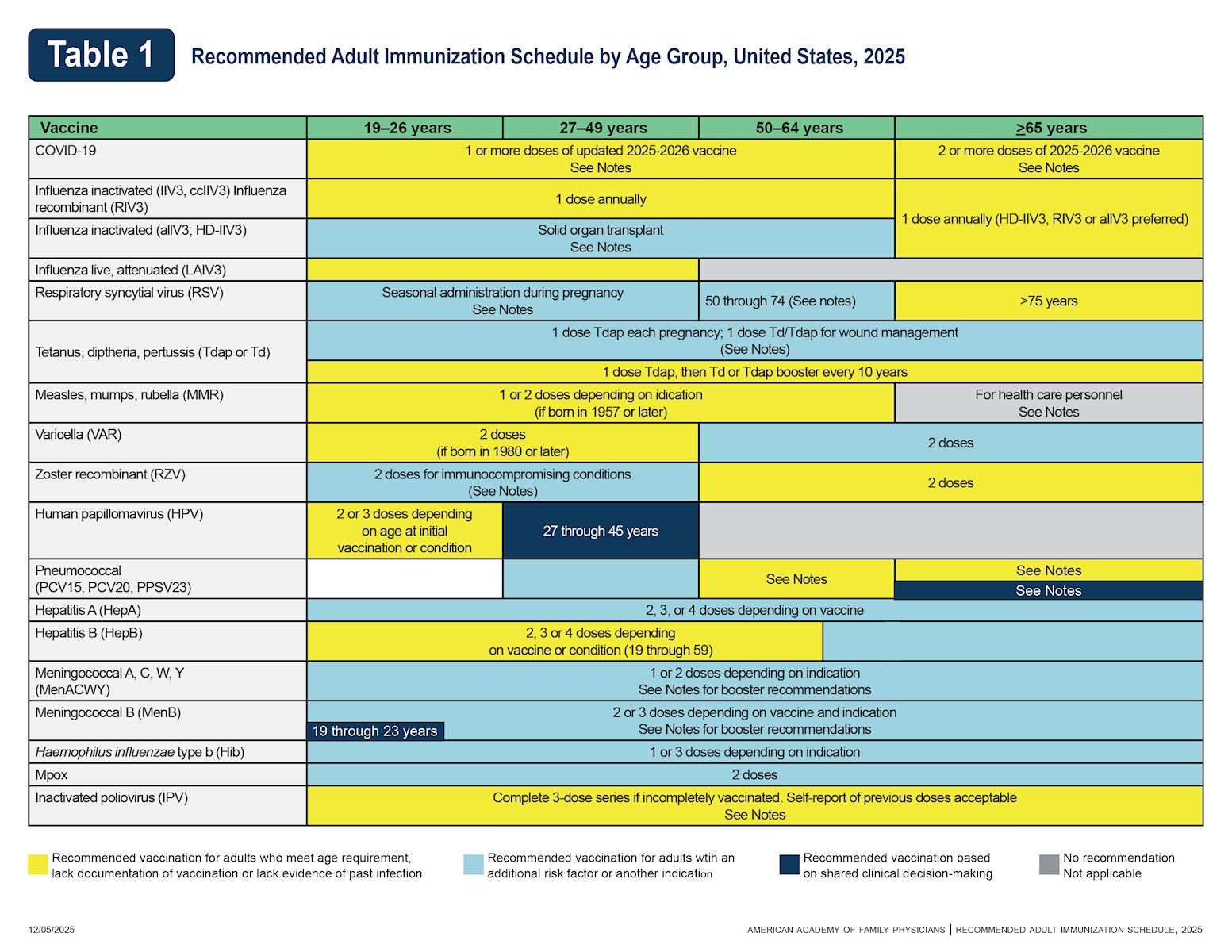 It’s important to stay up-to-date on your immunizations. Shots protect you against illness and disease. For many diseases, a single shot provides immunity. The flu shot is the only annual vaccination you may need since the most common strains change every year. Here’s the recommended vaccination schedule for adults 19 and older (pulled from the American Academy of Family Physicians).